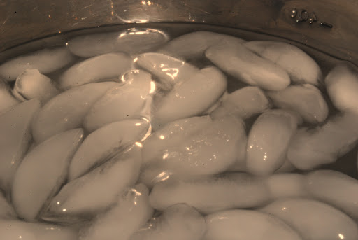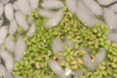 Drain the peas in a colendar and then pur them immediately into the ice water. It won’t take long for them to cool. Remove the ice with a slotted spoon and drain the peas once more in the colendar.