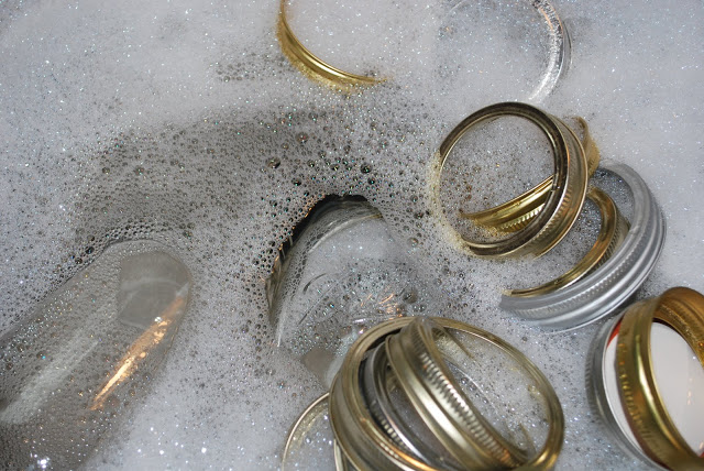 | Wash jars, bands and lids in hot, soapy water. |