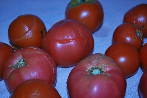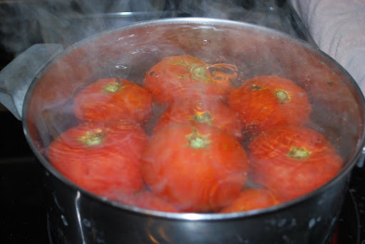 | Submerge tomatoes a few at a time into boiling water. 30 seconds should be plenty of time. There is no need to put them in ice water. Just let them cool a few minutes before removing the peeling. |